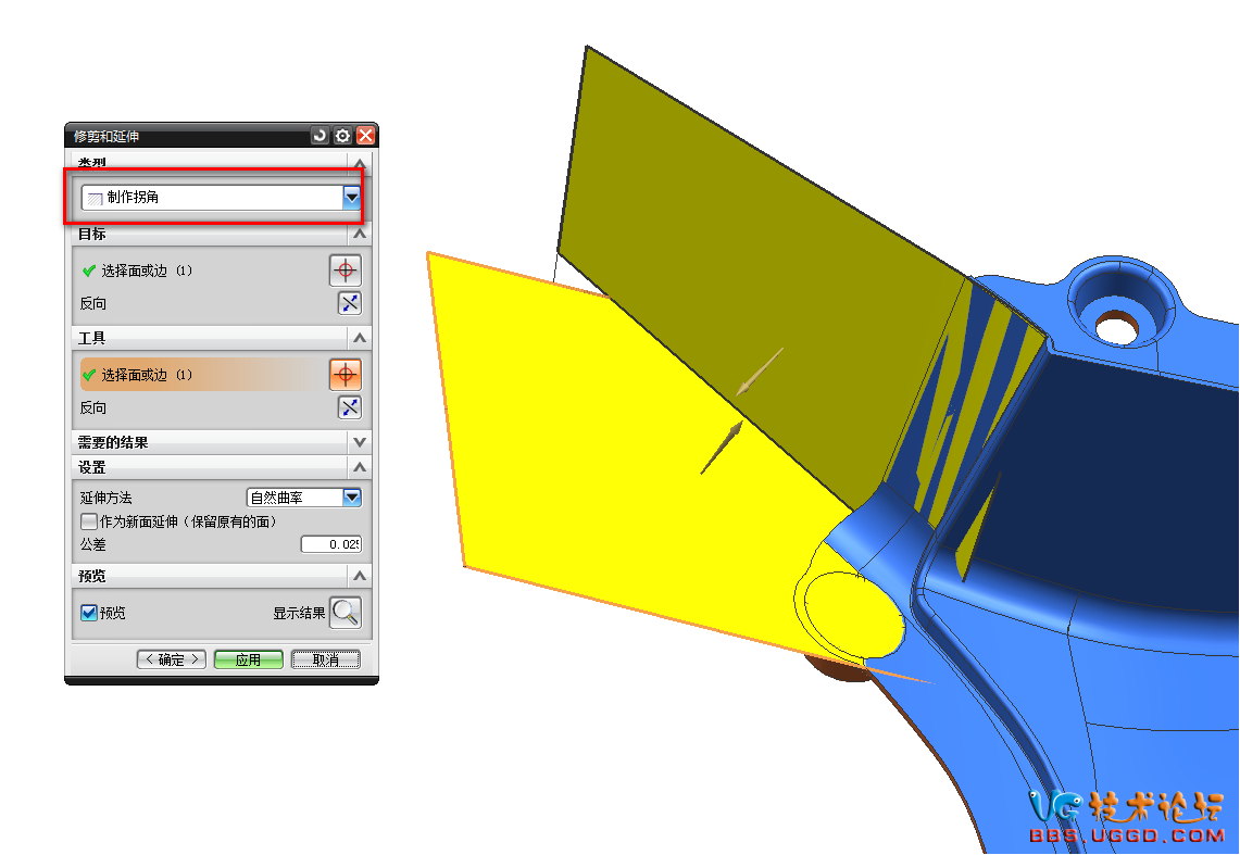 2.用“修剪和延伸”命令將兩個(gè)面創(chuàng)建拐角,注意類型選擇制作拐角,結(jié)果如圖所示