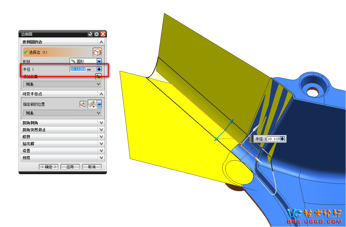3.用“幾何屬性”命令測(cè)量兩個(gè)面之間的R角是多少,并且將R角的數(shù)據(jù)復(fù)制下來,然后用“邊倒圓”命令將R角倒上,粘貼R角的數(shù)據(jù)到半徑1對(duì)話框中,確定